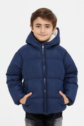 جاكيت بقبعة باللون الكحلي للأولاد الصغار