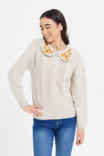 بلوفر مطرز بياقة بيتر بان باللون البيج للبنات الكبار
