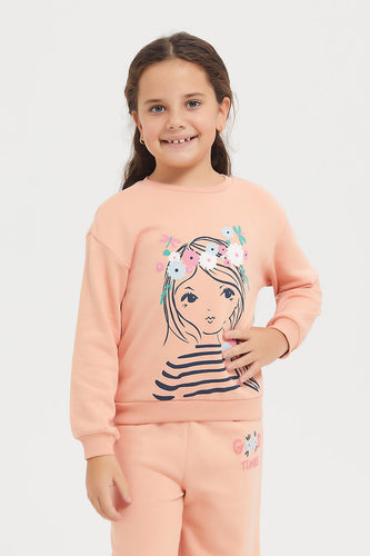 سويت شيرت بناتي مطبوع بأكمام طويلة باللون الوردي