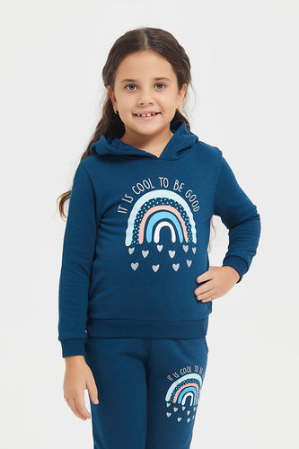 سويتشيرت مطبوع بقبعة باللون الكحلي للبنات الصغار