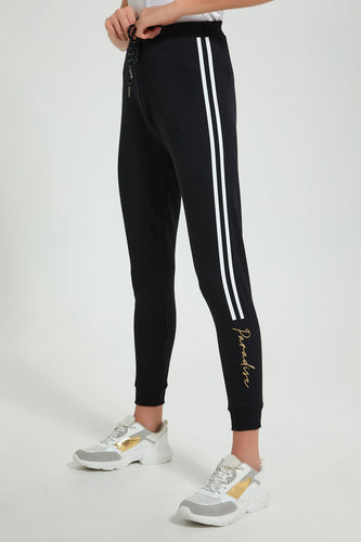 Black Basic Jogger With Side Applique جوغر باللون الأسود بخطوط بيضاء على الجانب