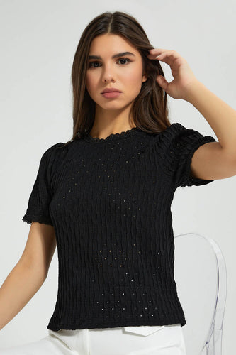 Black Crinkled Top بلوزة بلون أسود مع تفاصيل مكشكشة
