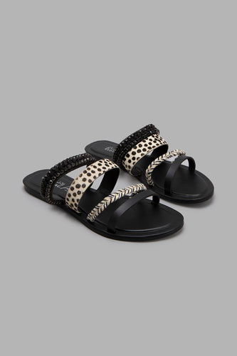 Black Strappy Embellished Mule صندل مسطح بلون أسود بشرائط متداخلة