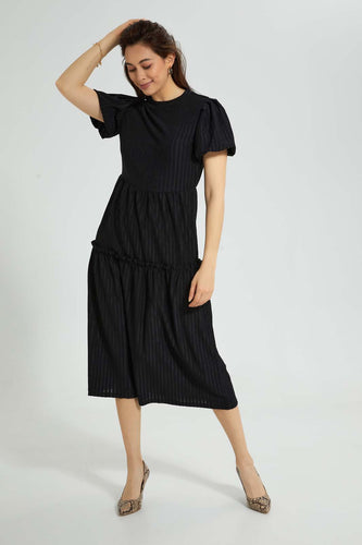 Black Tiered Rib Dress فستان تحت الركبة باللون الأسود