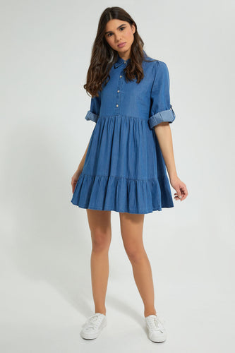 Blue Denim Gathered Dress فستان جينز باللون الأزرق