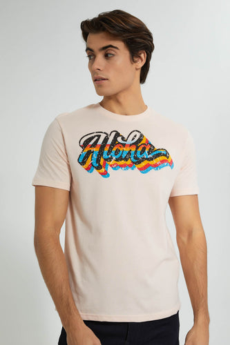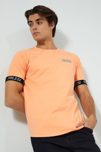 Peach Stretch T-Shirt With Cuff Tape تيشيرت باللون المشمشي بحواف مطبوعة على الأكمام