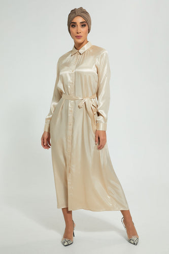 Beige Satin Shirt Dress فستان بأزرار ستان باللون البيج