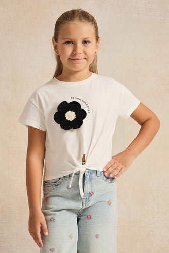 • تي شيرت أبيض للبنات معقود بزهرة كروشيه