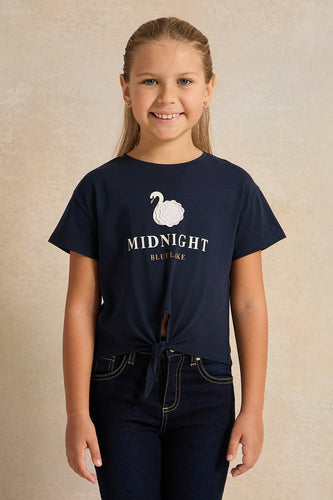 • تي شيرت بناتي أزرق داكن بعقدة كروشيه على شكل بجعة