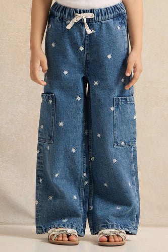• بنطلون جينز أزرق مطرز واسع الساق للبنات