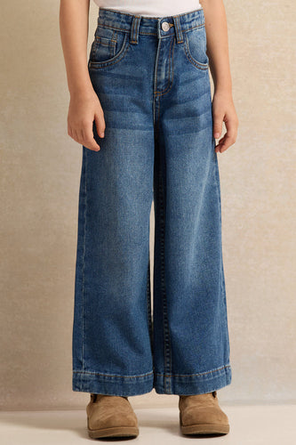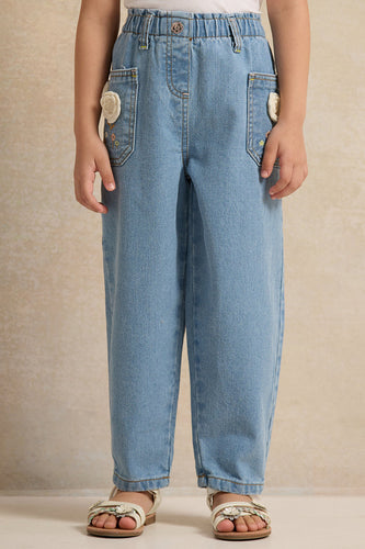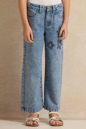 • بنطلون جينز أزرق مطرز واسع الساق للبنات