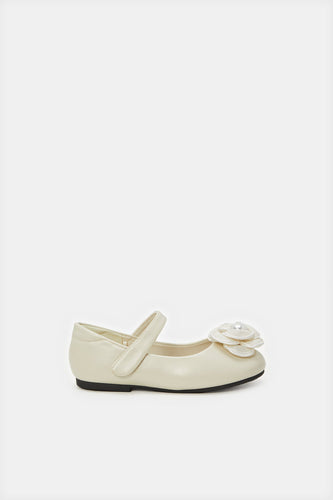 • حذاء باليه مزينة بزهرة اللؤلؤ باللون البيج للبنات