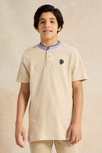 تي شيرت بولو للأولاد الكبار، لون بيج، من قماش شامبراي، بياقة ماندرين