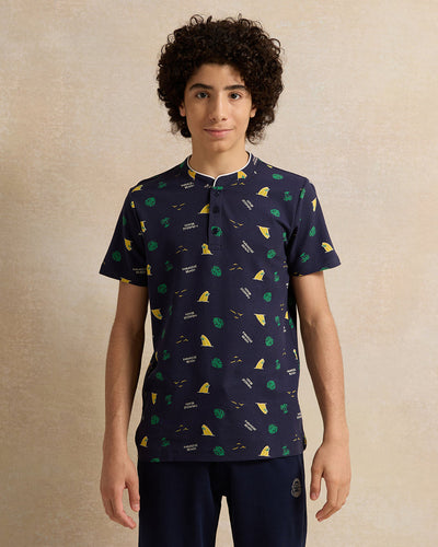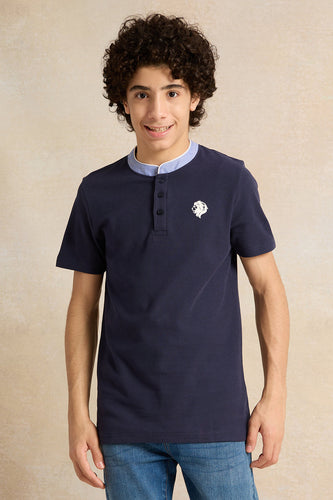 تي شيرت بولو أزرق داكن بياقة ماندرين للأولاد الكبار