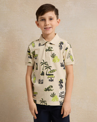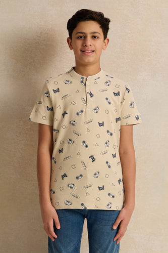 • قميص بولو مطبوع باللون البيج للأولاد الكبار