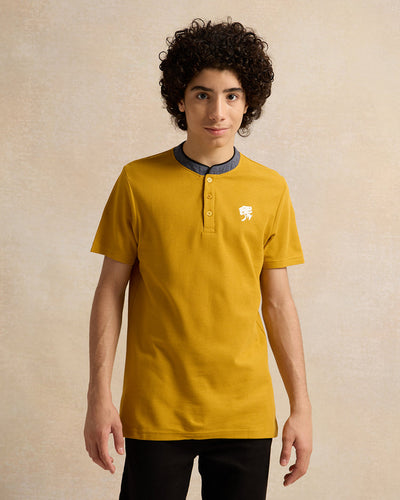 • قميص بولو للأولاد الكبار باللون الخردلي وياقة الماندرين