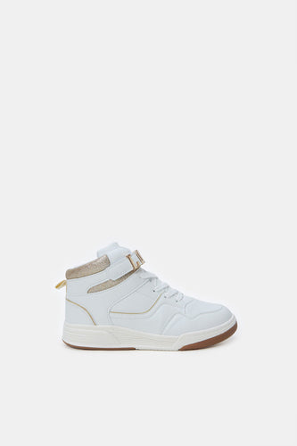 حذاء رياضي أبيض لامع عالي الرقبة للفتيات الكبيرات