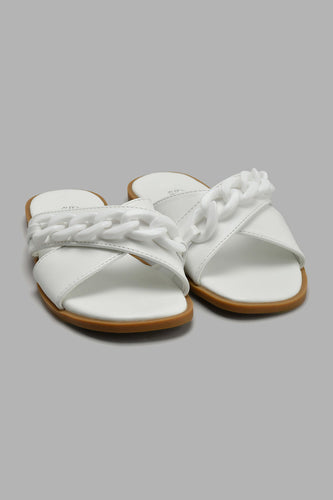White Chain Embellished Mule صندل مفتوح باللون الأبيض مزين بسلسلة