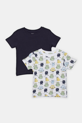 طقم تيشيرتات مطبوع باللون الأبيض و الكحلي للأولاد الرضّع(قطعتين)