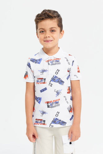 تيشيرت بولو مطبوع باللون الأبيض للأولاد الصغار