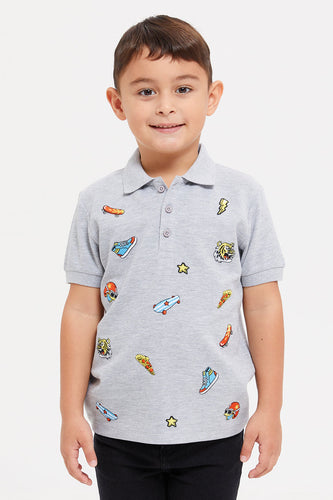 ت يشيرت بولو مطرز باللون الرمادي للأولاد الصغار