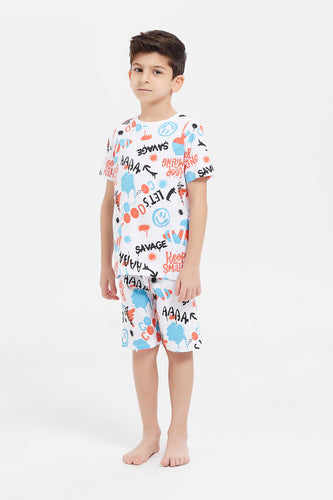 طقم بيجامة مطبوعة باللون الأبيض للأولاد الصغار (قطعتين)