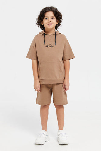 طقم تي شيرت بني كبير الحجم بغطاء للرأس مع شورت للأولاد (قطعتان)