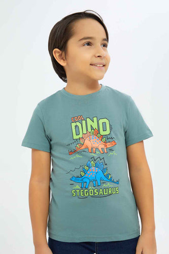 تي شيرت برسومات دينو للأولاد باللون الأزرق بإكمام صغيرة