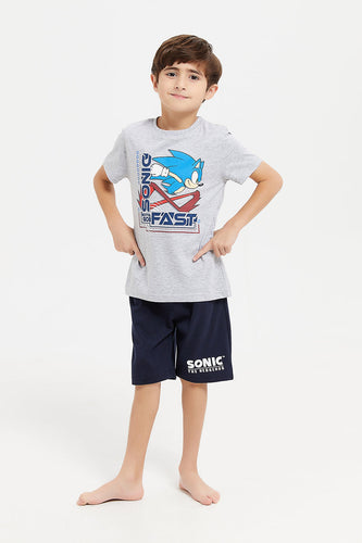 طقم بيجامة بطبعة سونيك باللون الرمادي والكحلي للأولاد الصغار (قطعتين)