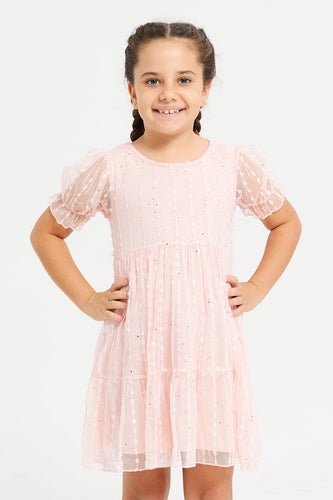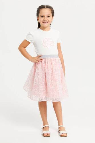 طقم توب وتنورة مزين باللون الوردي والأبيض للبنات الصغار (قطعتين)