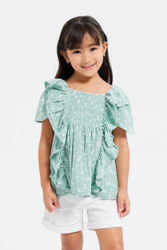 توب مزين بطبعة وبكشكش علي الصدر باللون الأخضر للبنات الصغار
