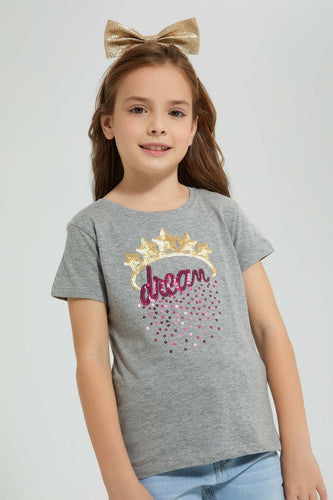 Grey Crown Sequin T-Shirt تيشيرت رمادي مزين بالترتر