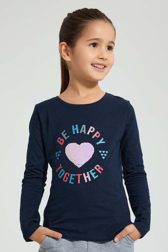 Navy Heart Sequin Long Sleeve T-Shirt تيشرت قلب مزين باللون الأزرق الغامق