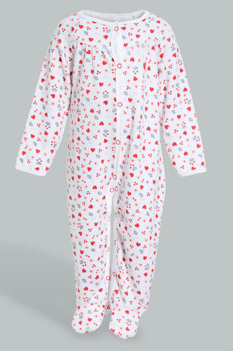 White Velour Sleepsuit With Red Heart Print رومبر قطيفة باللون الأبيض بطبعة قلوب حمراء