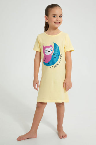 Yellow Owl And Moon Nighshirt فستان نوم مطبوع باللون الأصفر