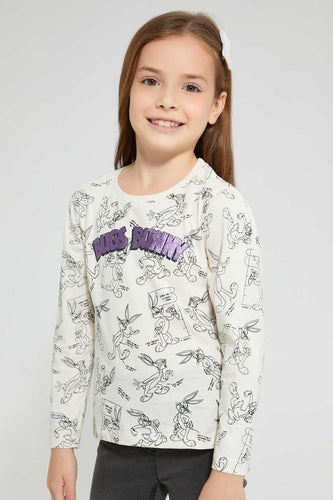 Cream Bugs Bunny Long Sleeve T-Shirt تيشيرت بطبعة باغز باللون الكريمي