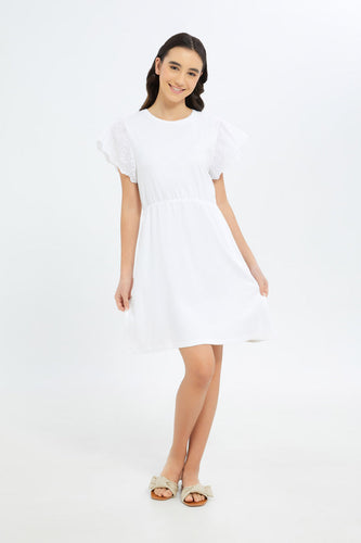 فستان باللون الأبيض و أكمام مزينة للبنات الكبار