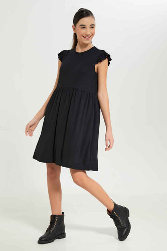 فستان بأكمام كشكشة باللون الأسود للبنات الكبار