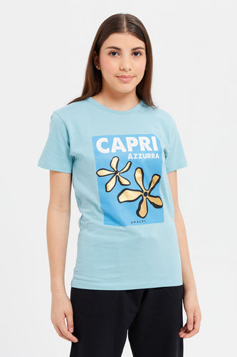 تي شيرت برسومات باللون الأزرق المخضر للفتيات الكبيرات