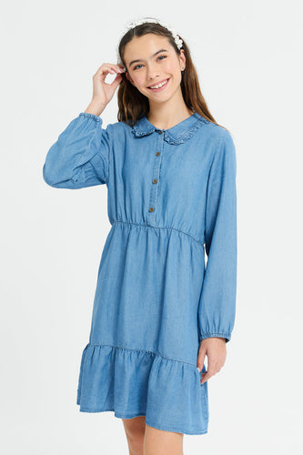 فستان للفتيات الكبيرات من قماش الدنيم الأزرق بياقة بيتر بان