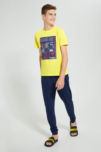 Yellow And Navy Game On Pyjama Set (2 Piece) طقم بيجامة بطباعة باللون الأصفر والكحلي (قطعتين)