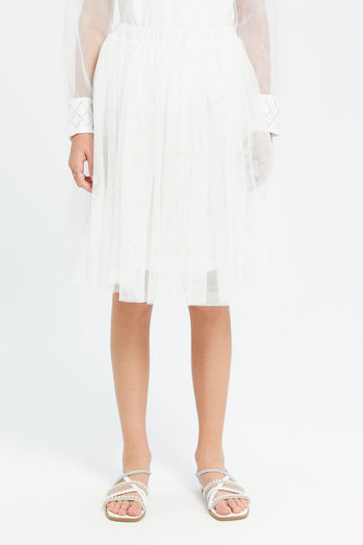 تنورة مزينة بالتول واللؤلؤ باللون الأبيض للبنات الكبار