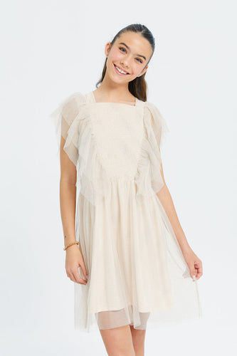 فستان مزين شفاف مزين بكشكش علي الصدر باللون البيج للبنات الكبار