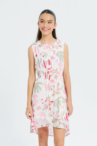 فستان بطبعة زهر باللون الأبيض بقصة طويلة قصيرة للبنات الكبار