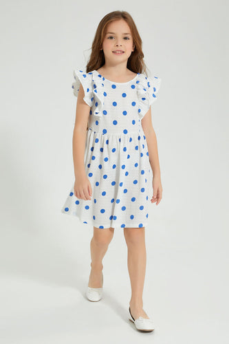 White And Blue Polka Dotted Dress فستان أبيض بتصميم منقط باللون الأزرق