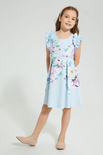 Blue Floral Dress With Ruffled Sleeve فستان أزرق بنقشة أزهار وأكمام مكشكشة