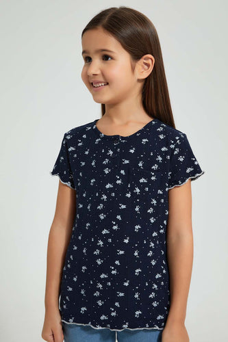 Navy Floral Print T-Shirt تيشرت بطبعة أزهار باللون الازرق