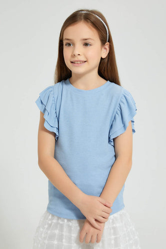 Blue Frill Sleeve T-Shirt تيشيرت بأكمام مكشكشة باللون الأزرق
