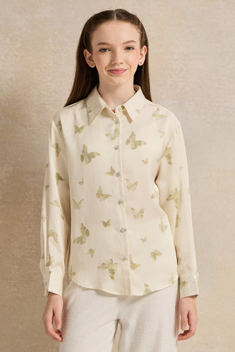 قميص مطبوع باللونين الأخضر والكريمي للفتيات الكبيرات