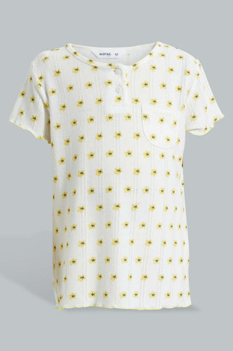 White And Yellow Floral Print T-Shirt تيشيرت باللون الأصفر والأبيض بطبعة ورود